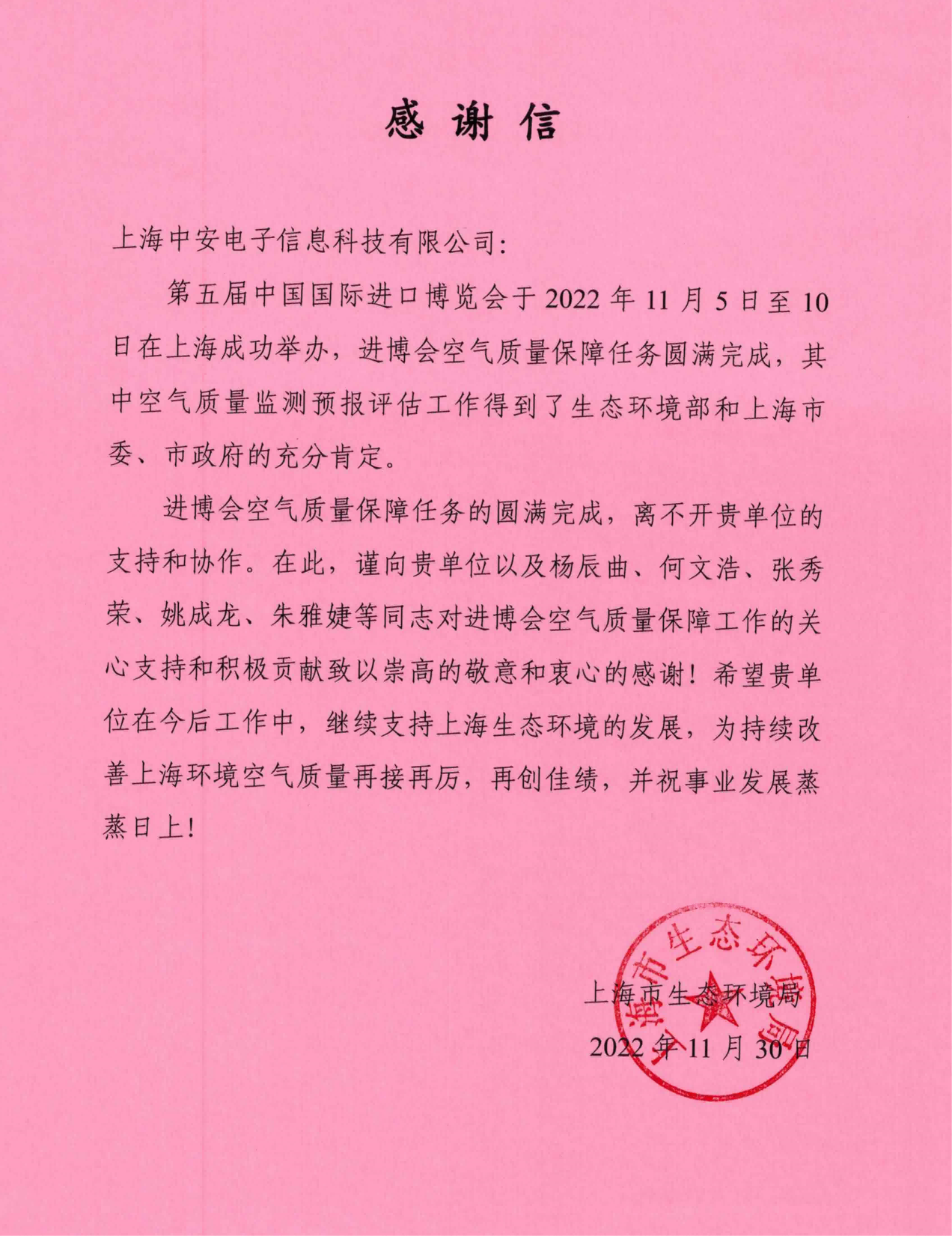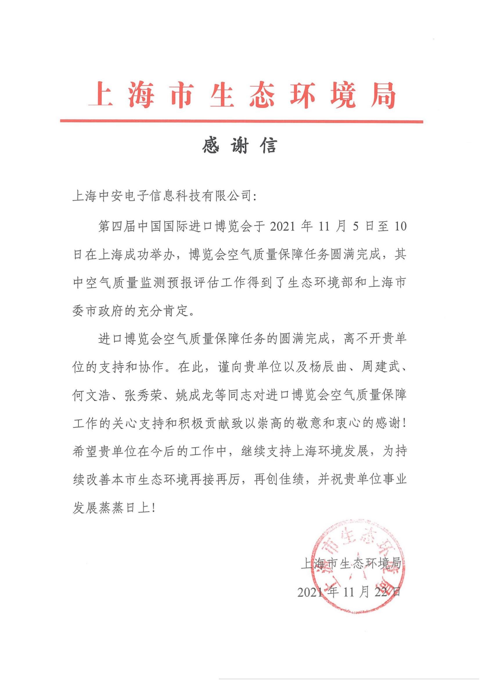 上海環(huán)監(jiān)中心就中安科技在21年國際進博會空氣質(zhì)量監(jiān)測預報工作中杰出貢獻送來感謝信!(2021/12/31)